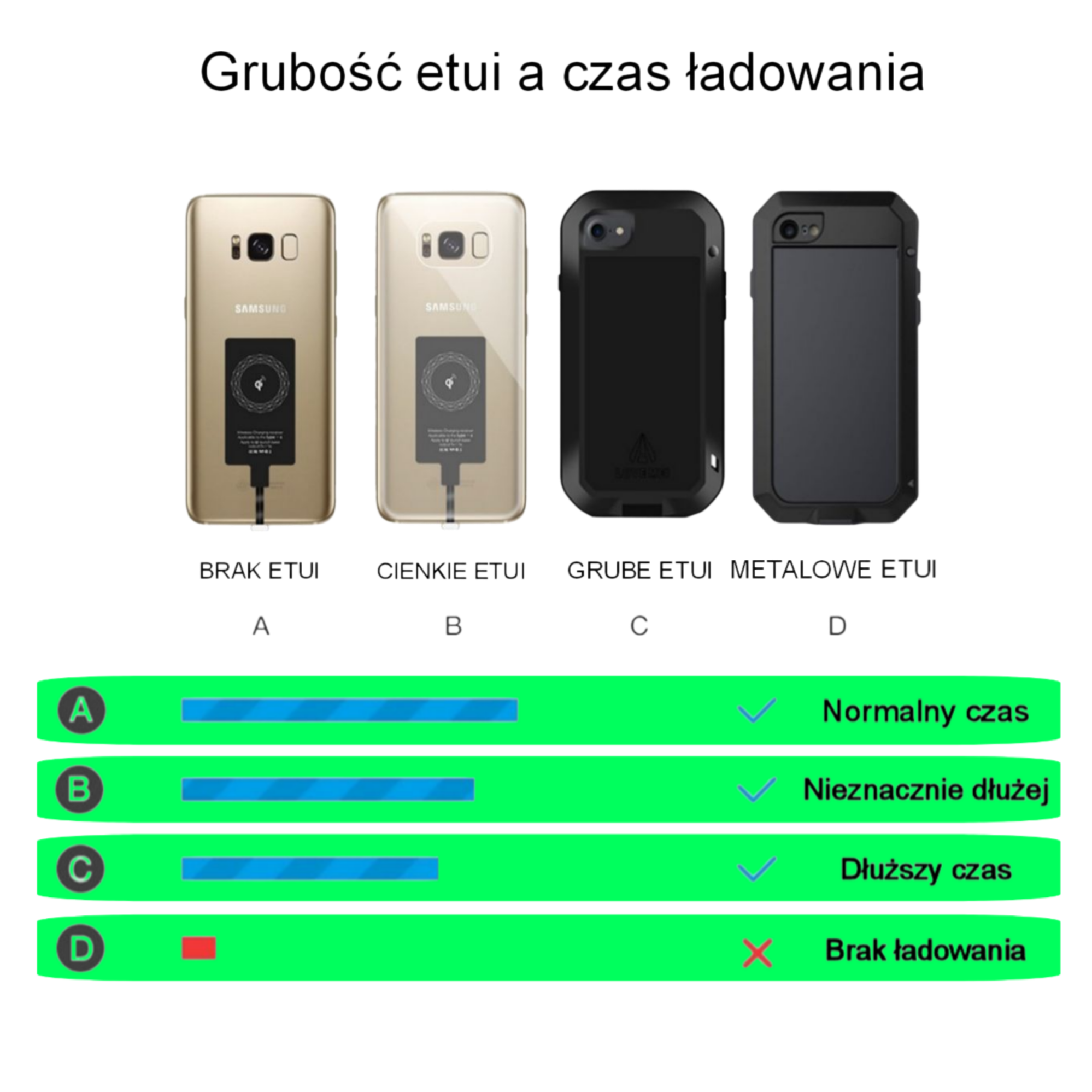 Nie – ładowarka działa z większością etui o grubości do 6 mm. Jednak bardzo grube pokrowce lub etui z metalowymi elementami mogą spowolnić ładowanie – wtedy warto je zdjąć.